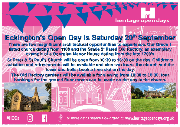 Is our Open Day in your diary for Saturday 20th September. There are 3 significant heritage events happening in Eckington under the banner of Heritage Open Days. For more detail visit our page.